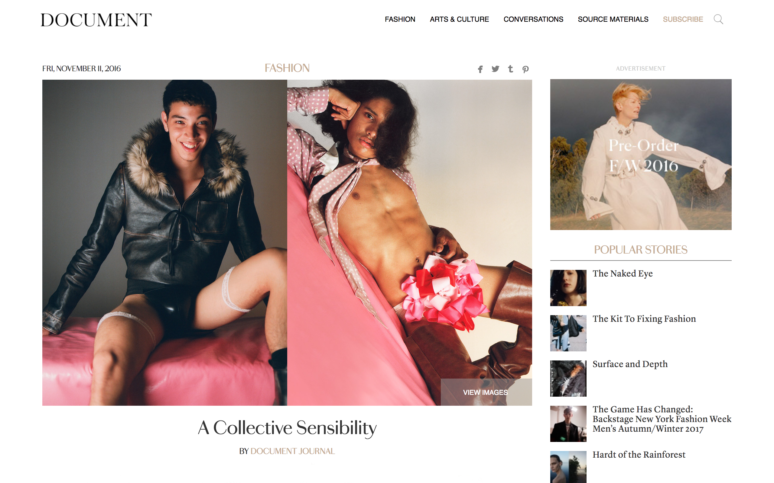 Document Journal is an independent culture, arts, and fashion magazine founded in New York in 2012. Published biannually in the spring and fall, the magazine is printed in book format and distributed globally.